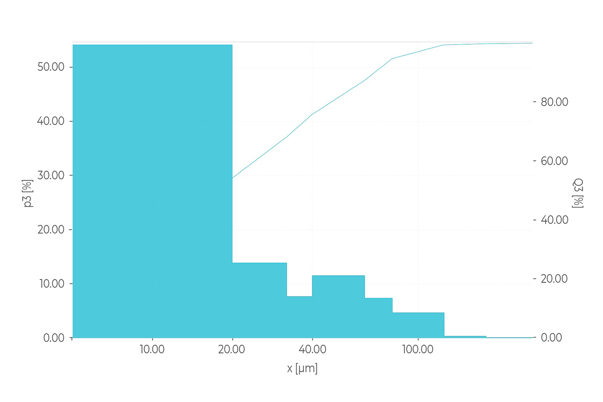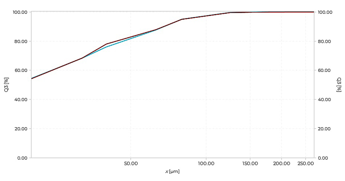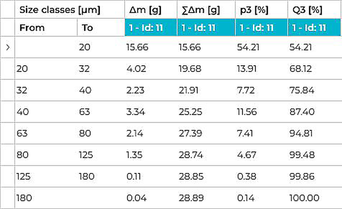 A 30 g cement clinker sample was sieved on the AS 200 jet pro using the standard procedure. Sieves with mesh sizes of 20, 32, 40, 63, 80, 125, and 180 µm were used. First, the sample was placed on the 20 µm sieve and sieved for 90 s. The oversize was then transferred stepwise to the next coarser sieve and sieved again until the 180 µm sieve was reached. Depending on sieve size, sieving times ranged from 60 to 90 s, with a negative pressure between 20 and 32 mbar. Nozzle rotation was maintained at 20 rpm throughout. The results can be displayed directly on the sieving machine in tabular form, as histograms, or as graphs. In this example, 54.21 % of the sample was below 20 µm. When comparing two samples, differences in the 32 - 40 µm and 40 - 63 µm fractions, for example, can be clearly visualized. This enables effective monitoring of production processes and rapid response in the event of deviations.
