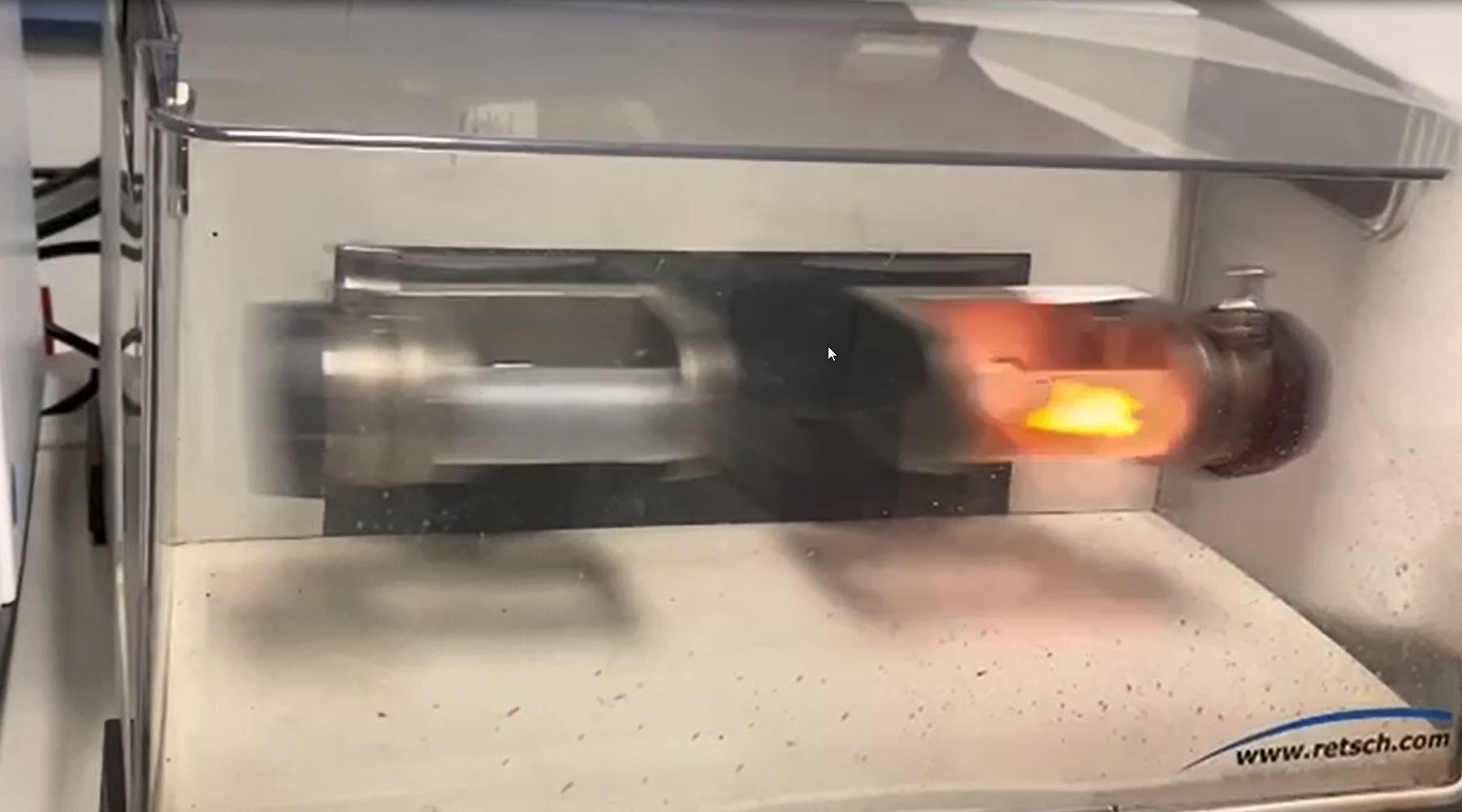 Mechanicky indukovaný samopropagační reakční děj při syntéze byl monitorován pomocí systému GrindControl. Po 20 sekundách mletí došlo k explozi, která vedla k výraznému zvýšení tlaku z 0 na 730 mbars a k nárůstu teploty. V této aplikaci umožnil systém GrindControl přesně sledovat dobu vznícení během syntézy, což byl jediný parametr, který reakci zajímal. [7]