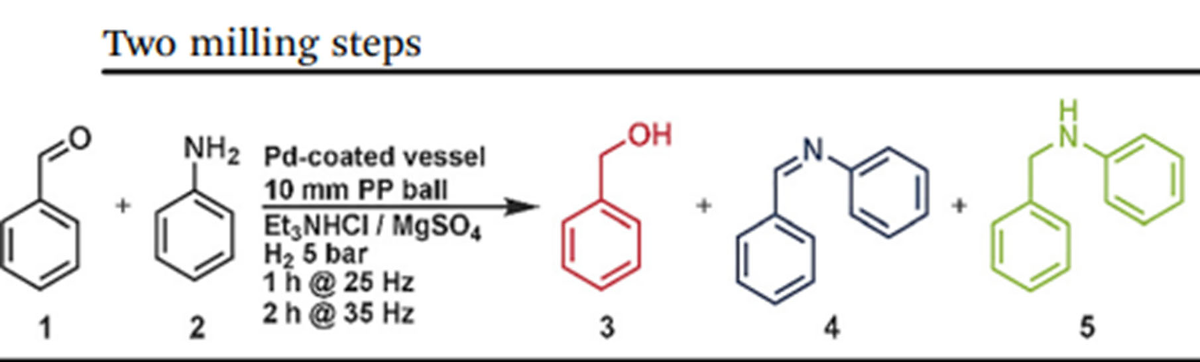 Sekvenční mletí při 25 Hz následované 35 Hz výrazně zvyšuje tvorbu aminů ve srovnání s použitím jedné frekvence. V prvním kroku při 25 Hz reaguje benzaldehyd s anilinem za vzniku iminového meziproduktu kondenzací. Ve druhém kroku při 35 Hz se tento imin hydrogenuje za vzniku požadovaného aminu. Pokud se použije pouze vysoká frekvence, benzaldehyd se přímo hydrogenuje na benzylalkohol, což vede k nežádoucím vedlejším produktům. Naopak, použití pouze nízké frekvence neposkytuje dostatek energie pro hydrogenaci, takže imin se nepřemění na amin. Dvoustupňový protokol potlačuje vedlejší reakce a umožňuje skutečný jednokrokový proces bez manipulace s meziprodukty. Celkově tento přístup vede k vyššímu množství a čistotě cílového aminu, což dokazuje robustnost a udržitelnost této metody reduktivní aminace. [12]