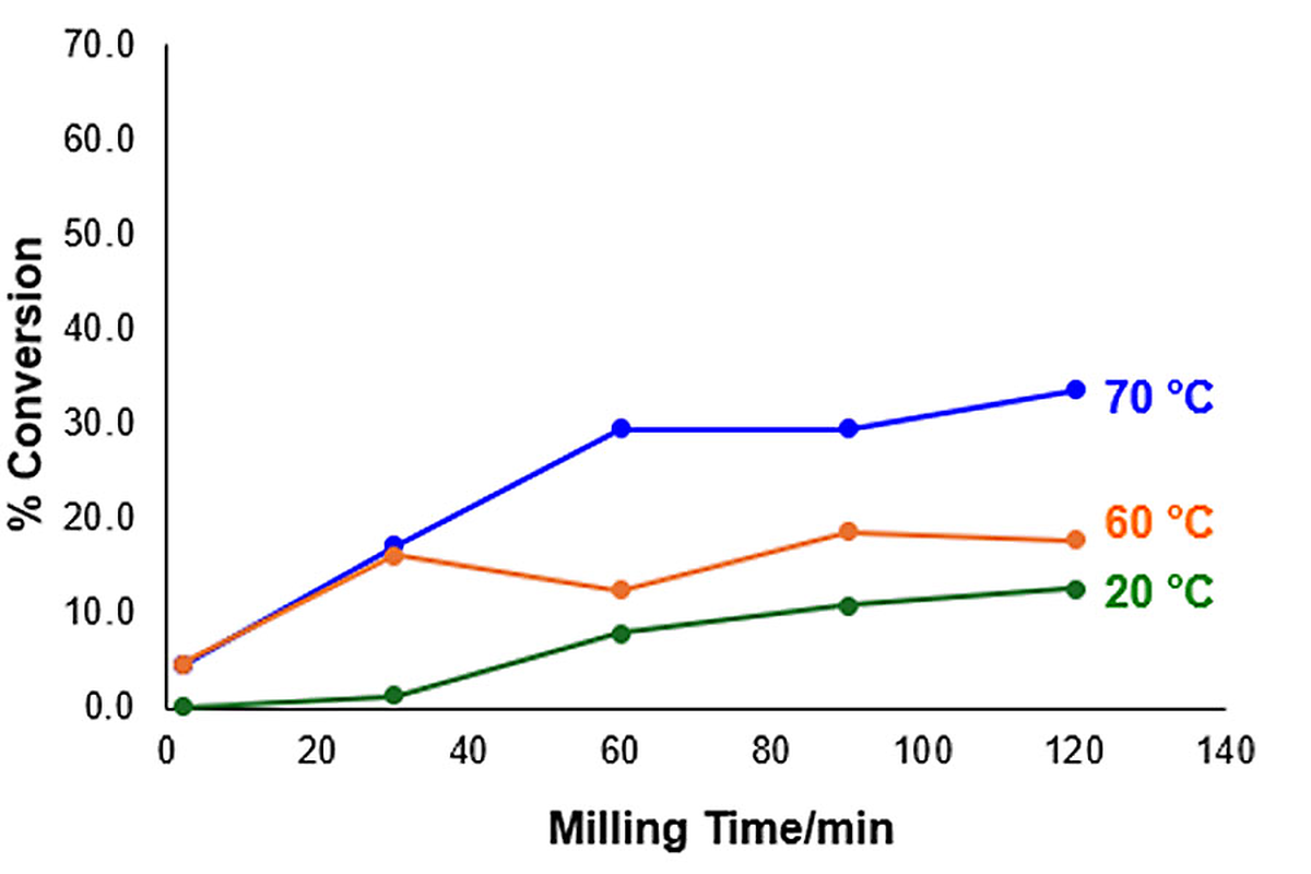 Druhý příklad ukazuje stupeň konverze během organické reakce provedené v kontrolním zařízení MM 500. Pouhé mletí reaktantů bez zahřívání poskytuje po 2 hodinách pouze 10% výtěžek. Zahřívání na 70 °C však tento výtěžek zvyšuje na 35 %. Dalšího zlepšení lze dosáhnout optimalizací měřítka, rychlosti mletí atd., ale pro dosažení dobrého výtěžku je rozhodující zahřívání.