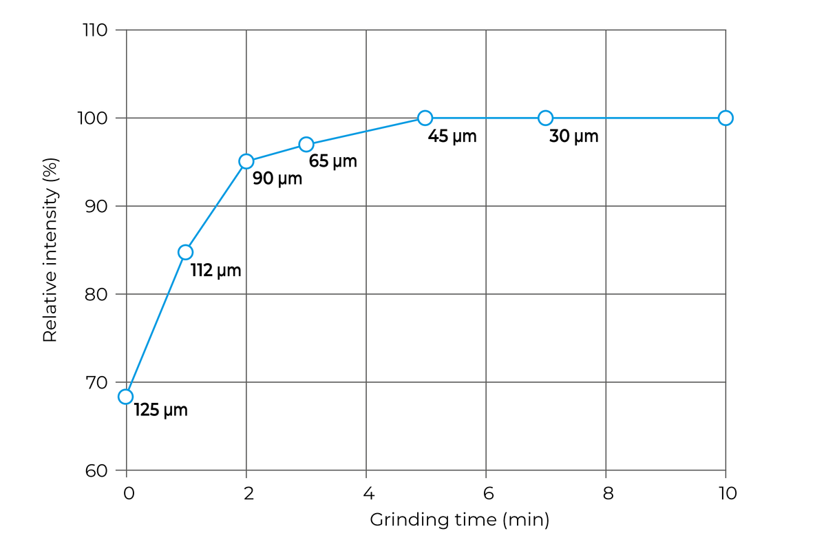 El tamaño de las partículas es un factor clave en la preparación de la muestra para el análisis XRF, ya que influye directamente en la representación de la capa de muestra analizada. En XRF, la profundidad de penetración describe hasta qué punto los rayos X primarios penetran en la muestra, mientras que la profundidad de escape define desde qué profundidad puede salir la radiación fluorescente característica de la muestra y ser detectada. La profundidad de escape está estrechamente correlacionada con el tamaño de las partículas. Si las partículas son demasiado gruesas, la capa analizada se vuelve desigual y deja de representar el material a granel. Reducir el tamaño de las partículas crea una capa de muestra más densa y homogénea, mejorando significativamente la calidad, fiabilidad y precisión del análisis XRF. Este efecto se demuestra claramente mediante la homogeneización de muestras de piedra caliza en un molino de discos RS 200, donde la disminución del tamaño de las partículas conduce a un aumento de la intensidad relativa de Kα y a una mayor precisión, especialmente en el análisis de silicio. Por tanto, una preparación eficaz de la muestra debe incluir al menos 2 minutos de homogeneización. Moler más allá de 2 minutos —especialmente más allá de 5 minutos— ofrece poco beneficio analítico adicional y principalmente aumenta el tiempo de procesamiento sin mejorar los resultados de XRF.