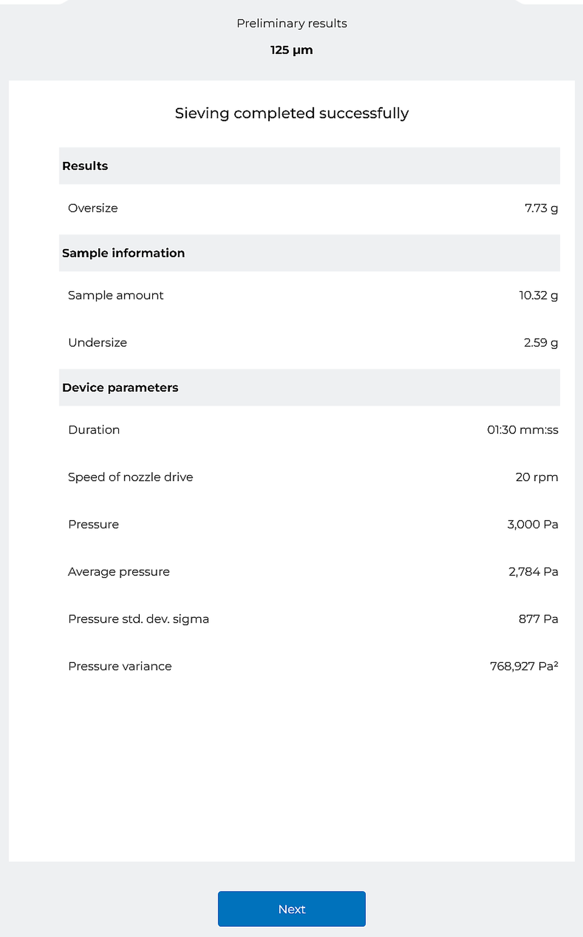 | Parameter setting per test sieve | Yes |