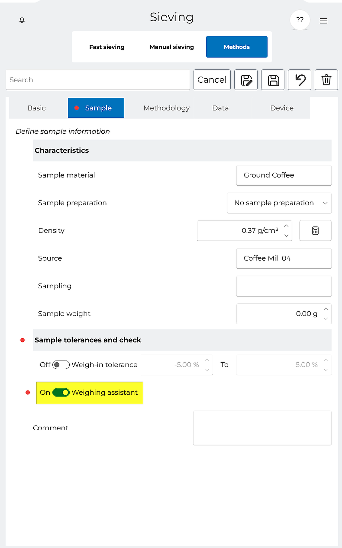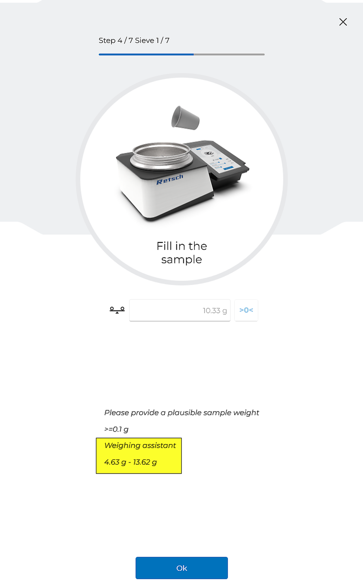 The “Weighing Assistant” exclusively can be used with RETSCH test sieves and can easily be activated/deactivated in the method.