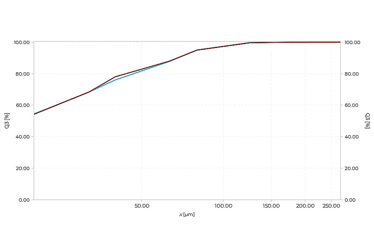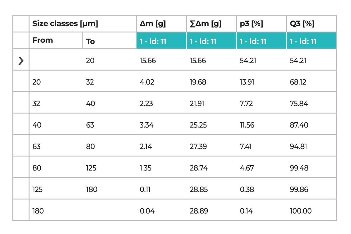 Vzorka cementového slinku s hmotnosťou 30 g bola sitovaná na zariadení AS 200 jet pro podľa štandardného postupu. Použili sa sito s veľkosťou ok 20, 32, 40, 63, 80, 125 a 180 µm. Najskôr bola vzorka umiestnená na sito s veľkosťou ok 20 µm a sitovaná po dobu 90 s. Následne bol nadrozmerný materiál postupne prenášaný na ďalšie hrubšie sito a opäť sitovaný, až kým sa nedosiahlo sito s veľkosťou ok 180 µm. V závislosti od veľkosti sita sa doba sitovania pohybovala od 60 do 90 s pri podtlaku medzi 20 a 32 mbar. Otáčky trysky boli počas celého procesu udržiavané na 20 ot/min.. Výsledky je možné zobraziť priamo na sitovacom stroji v tabuľkovej forme, ako histogramy alebo ako grafy. V tomto príklade bolo 54,21 % vzorky menšie ako 20 µm. Pri porovnaní dvoch vzoriek je možné jasne vizualizovať rozdiely napríklad vo frakciách 32 – 40 µm a 40 – 63 µm. To umožňuje efektívne monitorovanie výrobných procesov a rýchlu reakciu v prípade odchýlok.